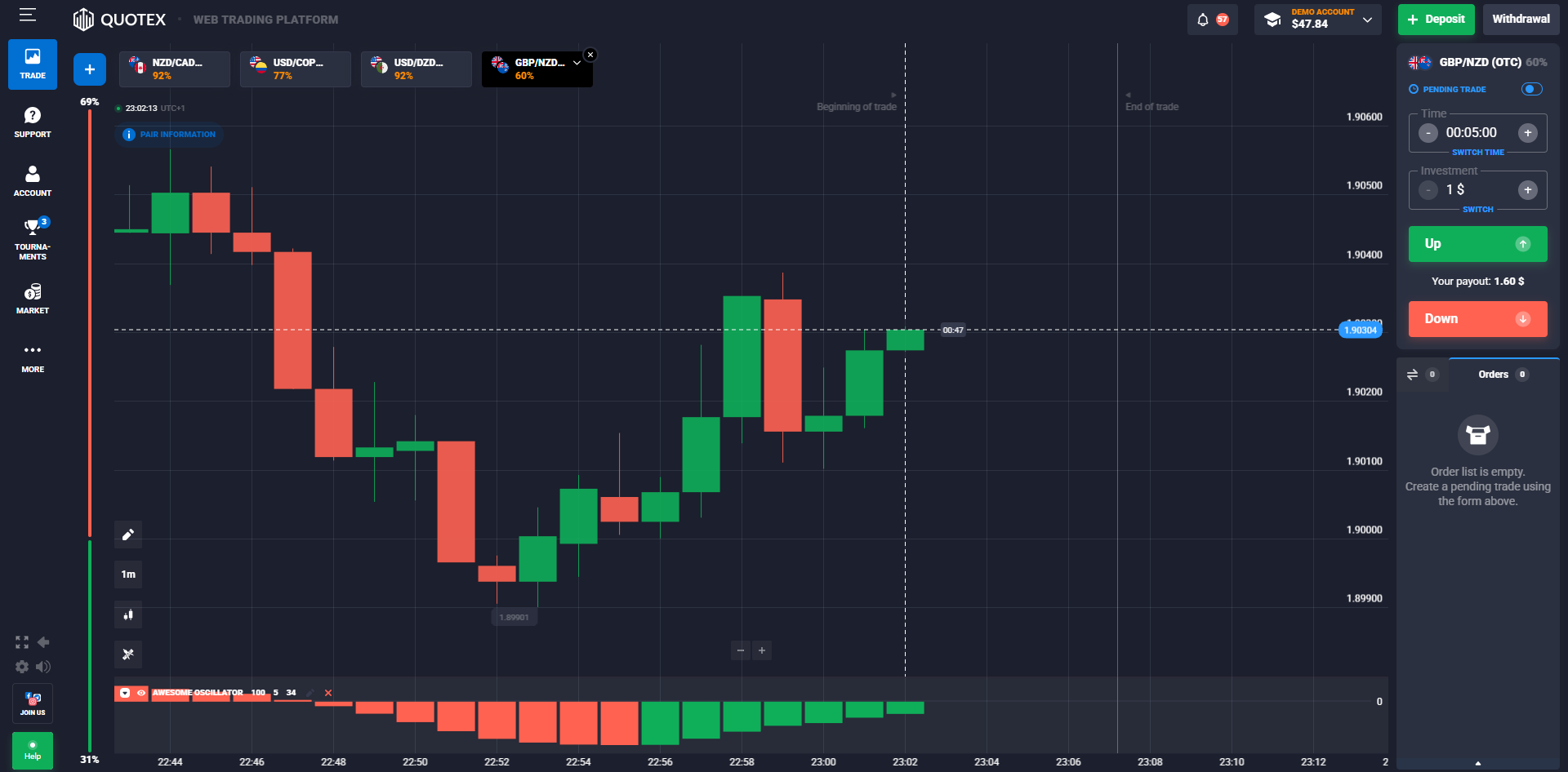 From the first moment you log in, everything feels straightforward. The layout is clean, modern, and well-organized, ensuring that you can find what you need without wasting time searching through menus. All the core tools — such as asset selection, chart customization, trade duration, and investment amount — are available on a single screen. You can open and close trades in seconds, monitor your balance easily, and adjust your settings with just a few clicks.